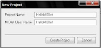 Buka Wireless Toolkit 2.5 lalu tekan tombol New Project untuk membuat project baru. Isikan nama project HelloMIDlet dan MIDlet class name HelloMIDlet kemudian tekan tombol Create Project. Pada saat keluar jendela Settings for Project tekan tombol OK.